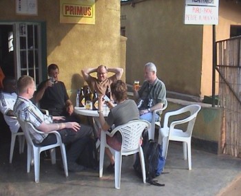 | Rast bei der Stadtrundfahrt in Kigali mit einem leckeren Primus-Bier und dem kleinen Adamo auf dem Schoß | |