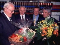 Bundespräsident Dr. Roman Herzog freut sich über ein typisches Straelener Geschenk: Gemüse und Blumen, die von Johannes Wyers (1997 2. Bürgermeister), Anton Berten (1997 Kämmerer) und Johannes Giesen (1997 Bürgermeister) überreicht werden (von links nach rechts). |